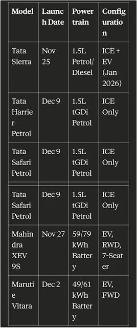 India’s mid-size SUV segment will see five new launches between late November and early December 2025. Tata Motors leads with three models, while Mahindra and Maruti Suzuki bring electric options to the crowded segment.