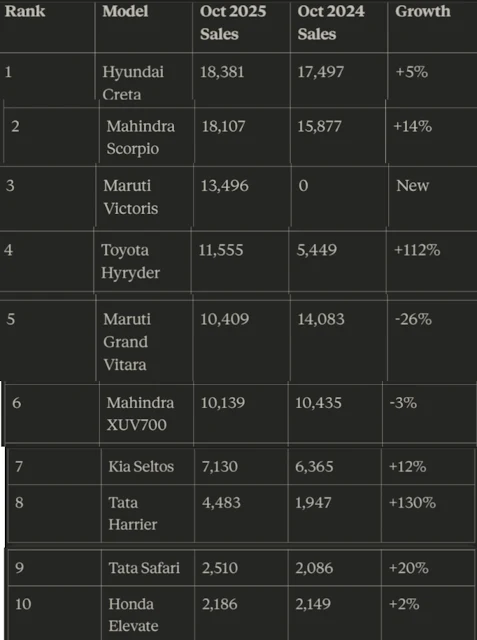 Quick Answer: Hyundai Creta topped India’s midsize SUV sales in October 2025 with 18,381 units, followed closely by Mahindra Scorpio (18,107 units) and the new Maruti Suzuki Victoris (13,496 units). Toyota Hyryder and Maruti Grand Vitara rounded out the top five positions.